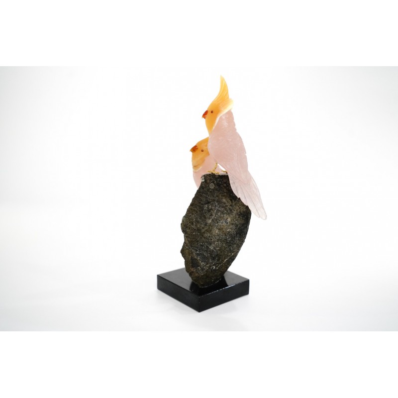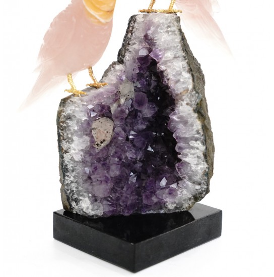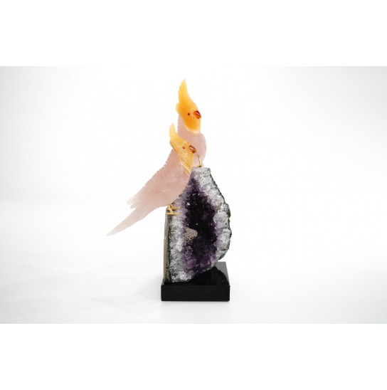 Head/Face/Body : Rose Quartz, Yellow Calcite Bird's Eyes : Red Garnet Bird's Beak : Agate Crystal Base : Amethyst