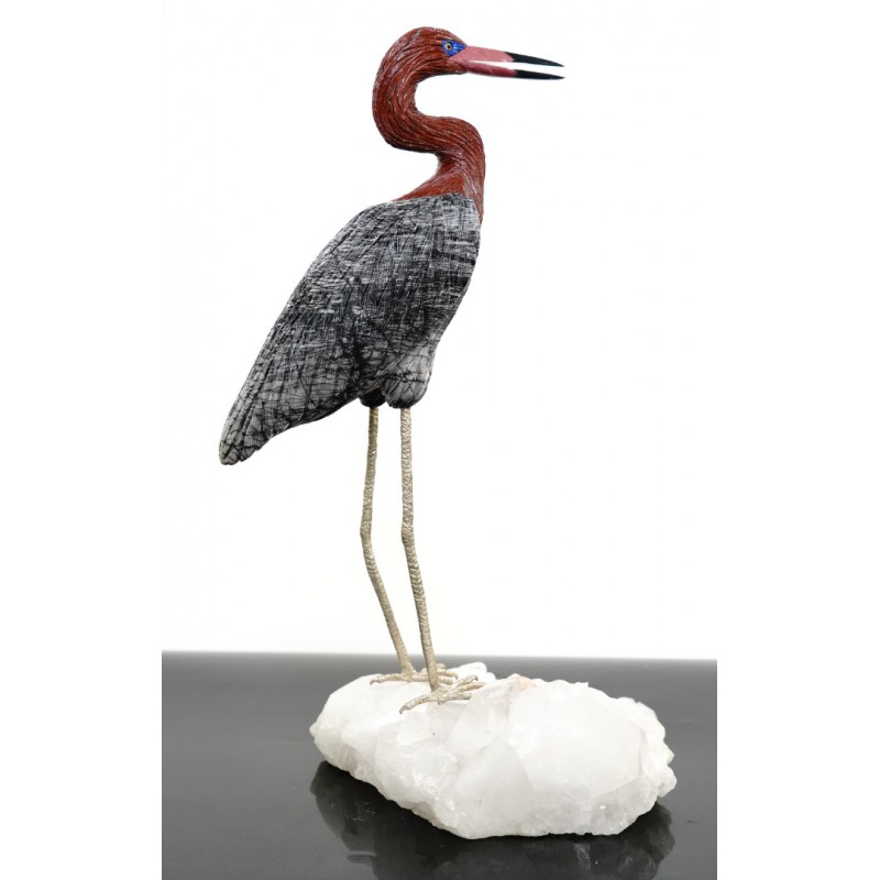 Head/Face/Body : Red Jasper, Zebra Jasper, Lapi Lazuli Bird's Eyes : Tiger Eyes and Obsidian Bird's Beak : Rhodolite, Black Calcite Crystal Base : Crystal
