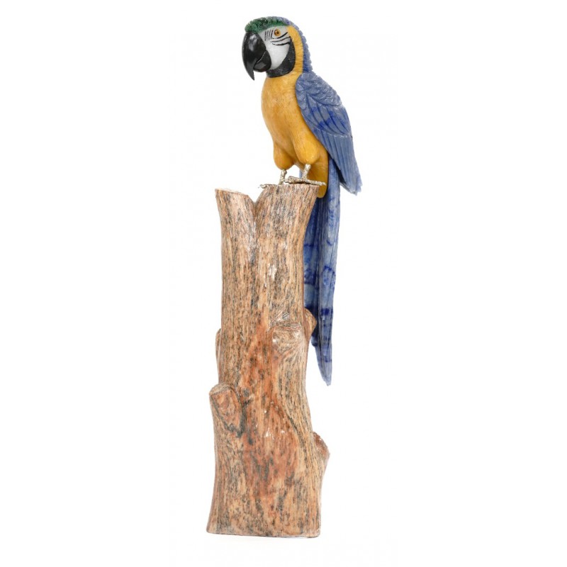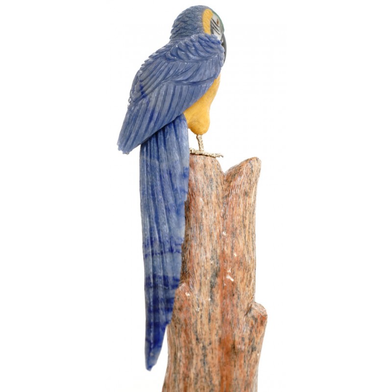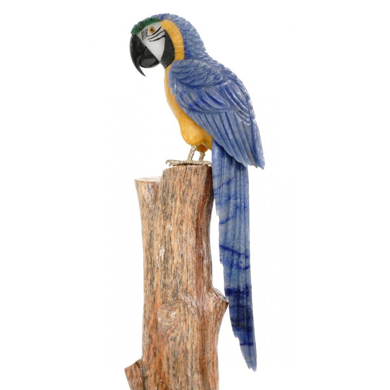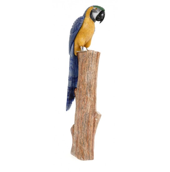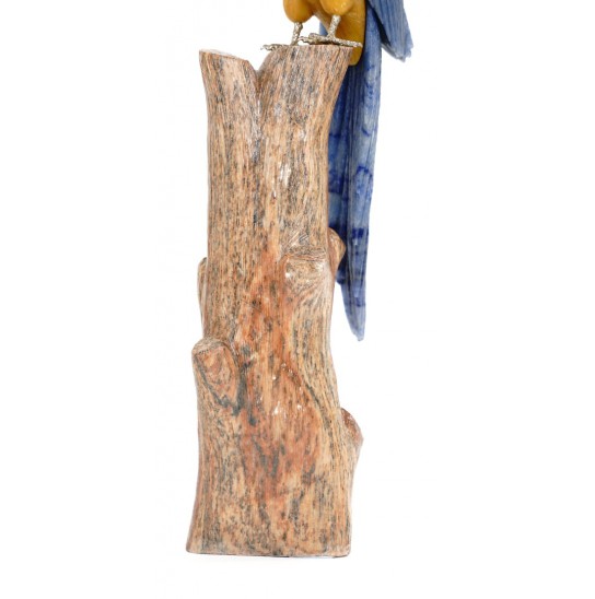 Head/Face/Body : Blue Quartz, Yellow Calcite, White Calcite, Green Quartz, Obsidian Bird's Eyes : Tiger eyes and Onyx Bird's Beak: Obsidian Crystal Base : Fossil Wood