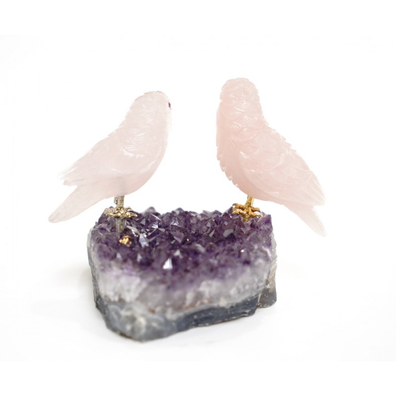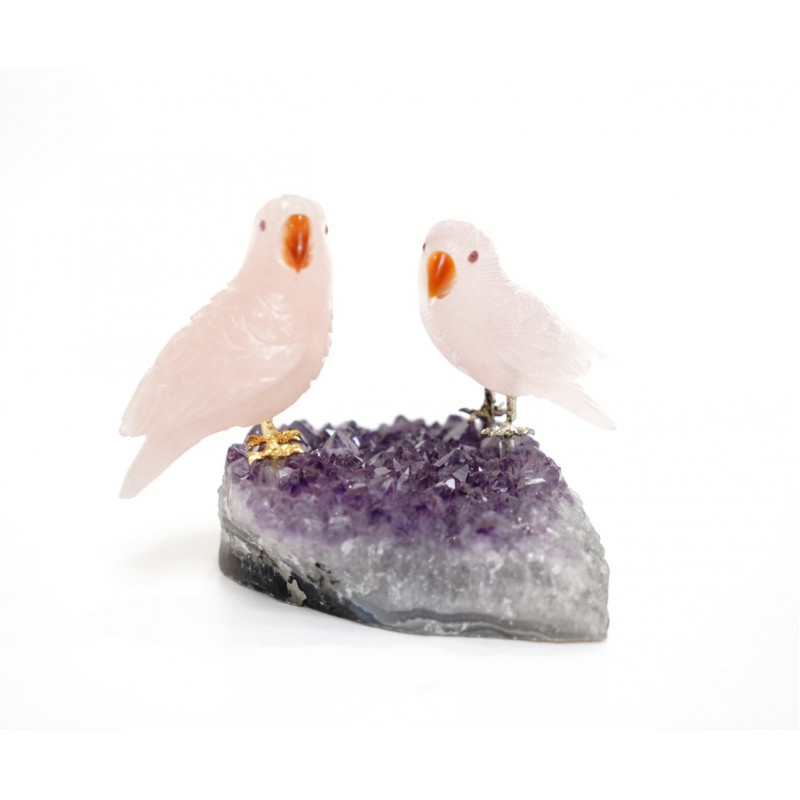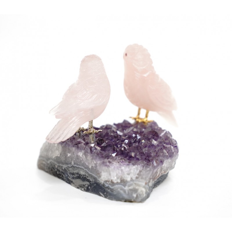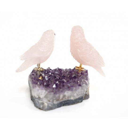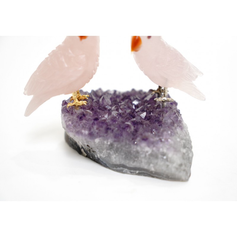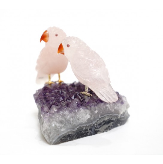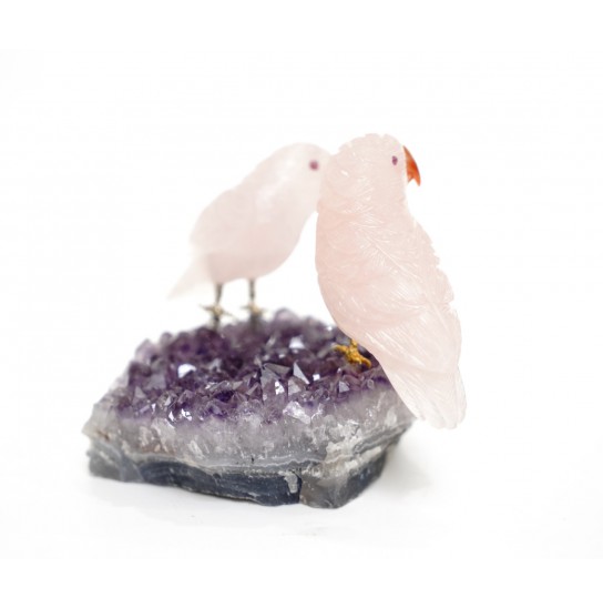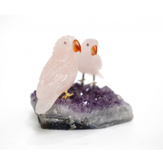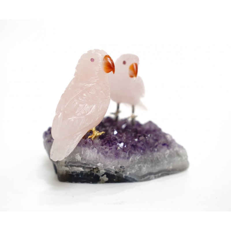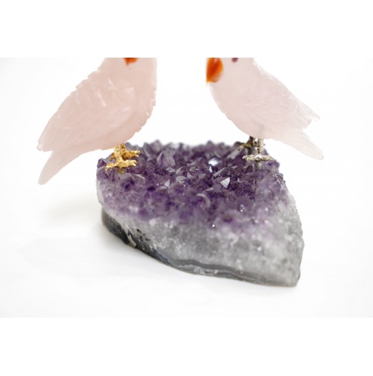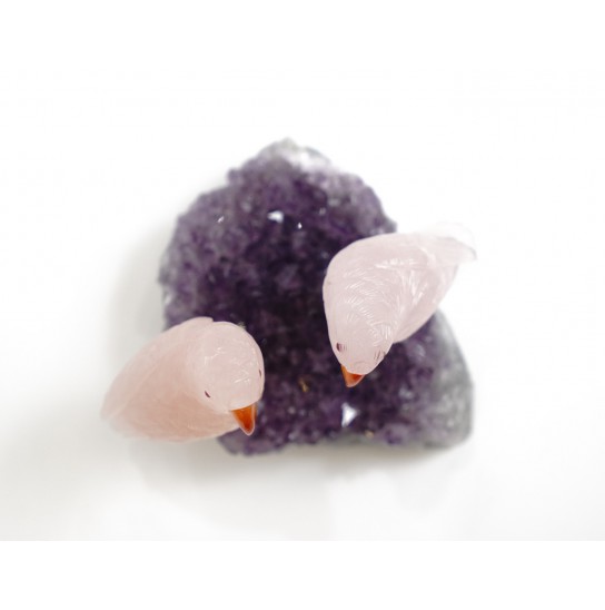 Head/Face/Body : Rose Quartz Bird's Eyes : Red Garnet Bird's Beak : Agate Crystal Base : Amethyst