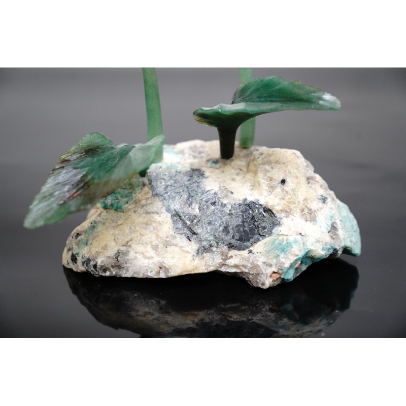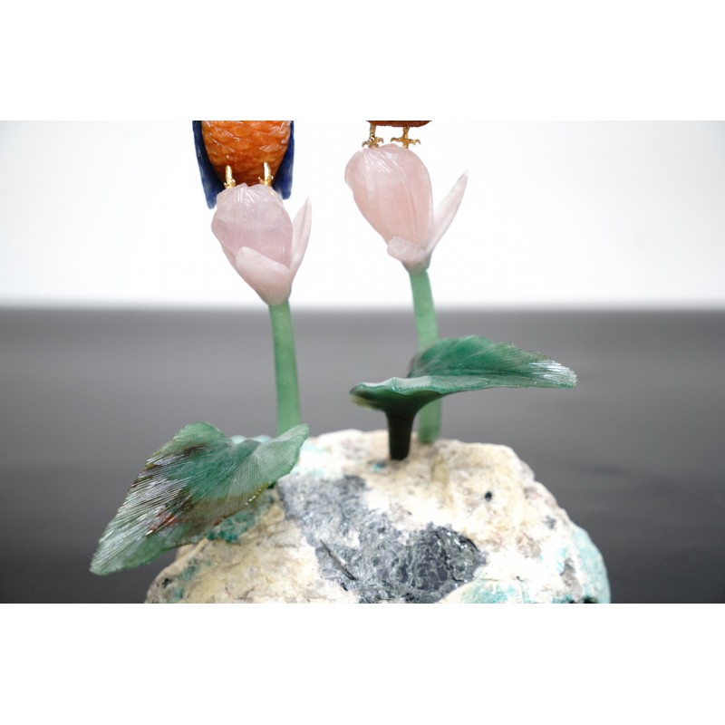 Head/Face/Body: Orange Calcite, Blue Quartz, White Calcite Bird's Eyes: Red Garnet Bird's Beak: Agate Crystal Base: Amazonite / Rose Quartz / Green Quartz